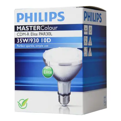 Le Philips CDM-R Elite 35W 930 E27 PAR30L 30D (MASTERColour) sono lampade a scarica compatte ad alogenuri metallici in ceramica dotate di riflettore. Sono lampade estremamente efficienti che presentano una potenza di 35W e sono dotate di attacco del tipo E27. Queste lampade a scarica compatte hanno una vita media di 15.000 ore. La resa dei colori delle Philips CDM-R Elite 35W 930 E27 PAR30L 30D (MASTERColour) é eccezionale grazie all'indice di resa cromatica di 90-100Ra: questo sta ad indicare che le caratteristiche degli oggetti illuminati sono poste in risalto in maniera ottimale.