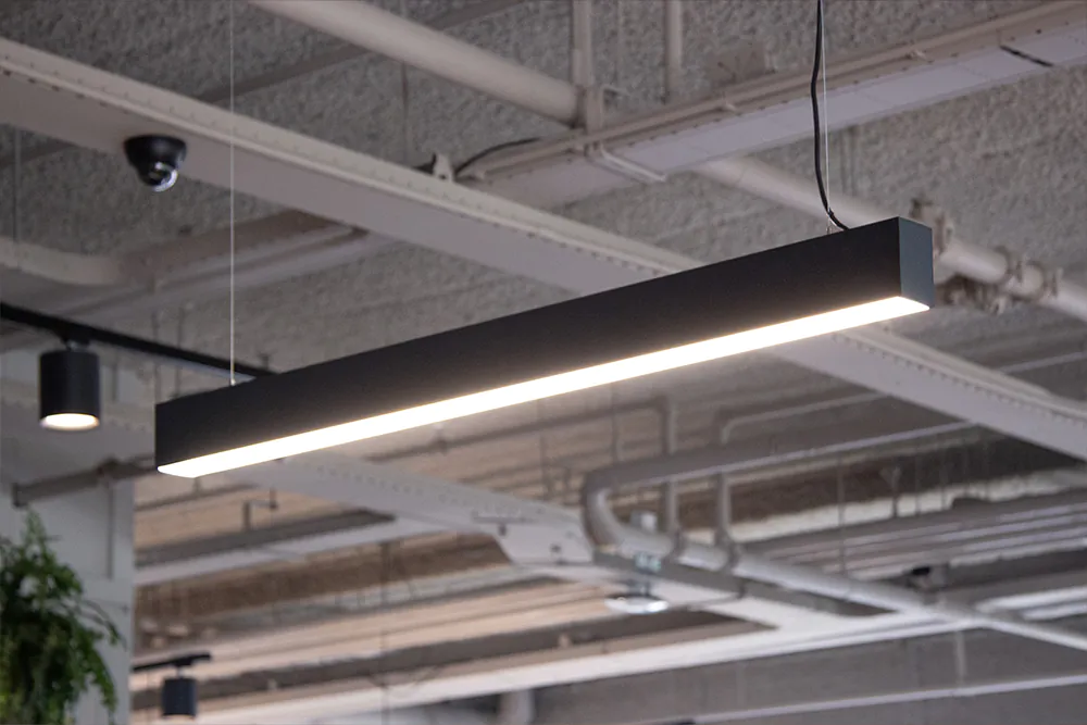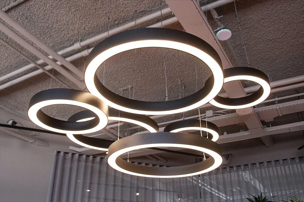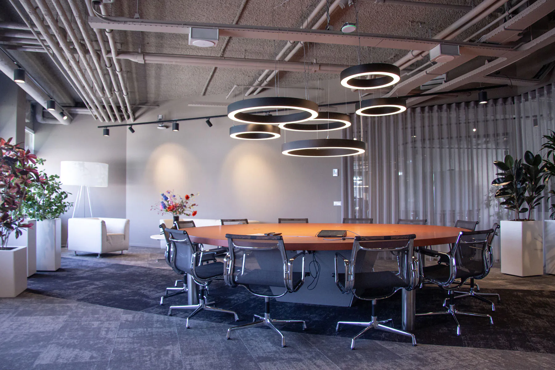 Per creare la giusta atmosfera con la luce abbiamo scelto apparecchi di Noxion e Nordlux, ma abbiamo anche deciso di far realizzare apparecchi su misura per il cliente. Creare un'atmosfera piacevole in ufficio, che contribuisca a far sì che i dipendenti si trovino bene in ufficio e li incoraggi ad andarci il più possibile. L'ufficio doveva anche avere un aspetto lussuoso, cosa che abbiamo cercato di trasmettere con i complementi d'arredo.